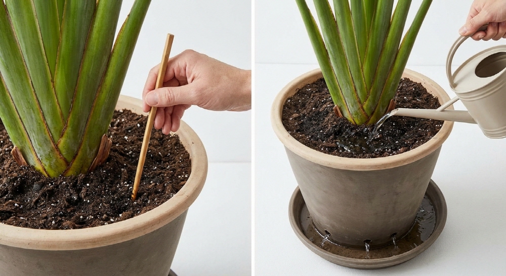여인초의 물은 화분의 흙을 찔러서 확인했을 때 말라있다면 그때 주면 됩니다. 평균 주 1~2회, 화분 전체의 물이 1/3정도 말랐을 때 물을 주는데, 보통 화분 위에서 3~5cm 정도까지 흙이 보송하게 말랐는지 확인합니다.