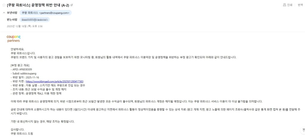 쿠팡 파트너스 운영정책 위반 메일 받고 심장 떨어질 뻔함 (오발송 확인법 & 대처)